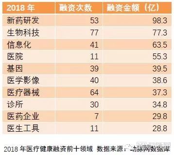 在排名前十的领域中,偏向于传统医疗的医院、诊所、医药企业、医疗器械等领域回暖,盈利能力、商业模式很容易验证的医疗实体受到更多的关注。另外,在医学影像领域获得融资的企业,大部分是以 人工智能 技术为基础的影像辅助决策企业。该领域的热度在2017年升起来之后,在2018年又相继获得大额融资。