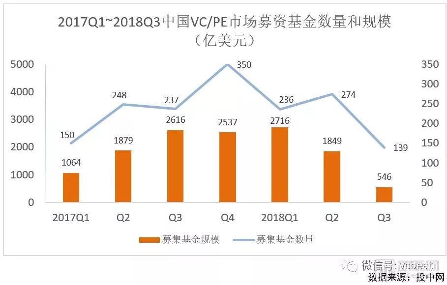 根据投中网数据,2018年Q3季度,仅有139支基金进入募资阶段,同比下降41.35%。而募资规模仅为545.53亿美元,同比下降超过70%,VC/PE市场大受影响,基金募资难度加大,资金规模大幅度缩减。