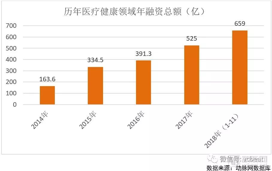 动脉网 数据库 显示,2014年到2018年(1-11月)这五年里,医疗健康行业的总融资额逐年攀升,从163.6亿大幅度上升到659亿人民币,CAGR为41.7%,增长速度非常快。
