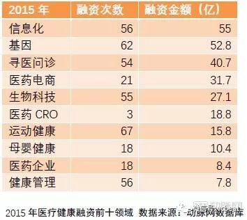 2015年是互联网医疗发展的黄金时期,医疗信息化企业和寻医问诊企业排名融资金额前三。医疗信息化、寻医问诊、医药电商、运动健康、母婴健康和健康管理这几个领域,都是互联网技术参与的主要场景,初创企业通过互联网手段来改造医疗服务流程和提升医疗服务质量。