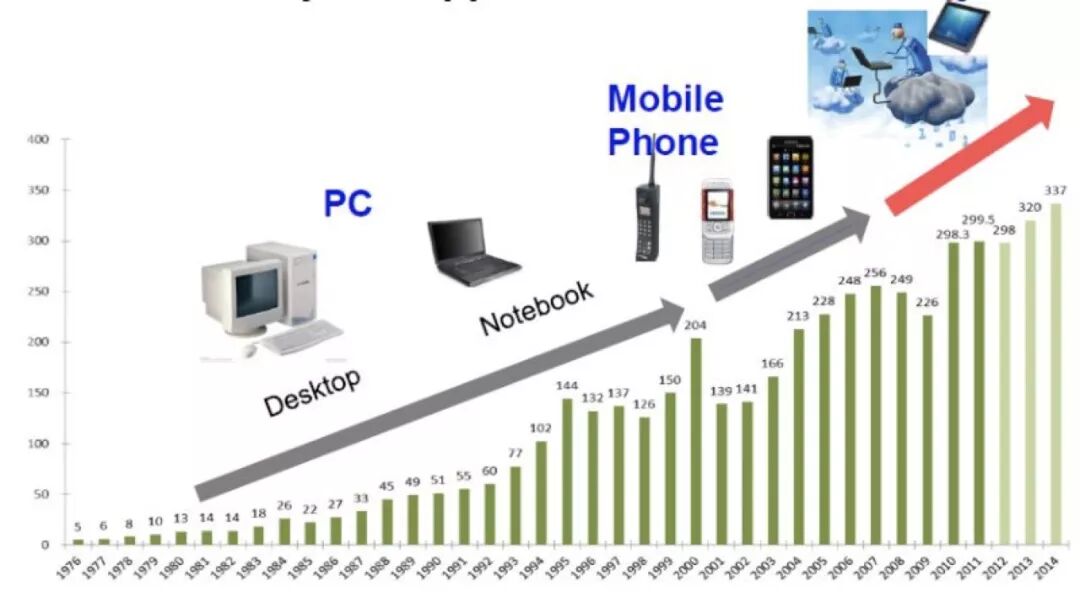 分析半导体市场的历史(如下图),我们会看到典型的周期性现象,即每个周期都会有一个明星应用作为引擎驱动半导体市场快速上升,而在该明星应用的驱动力不足时半导体市场就会陷入原地踏步甚至衰退,直到下一个明星应用出现再次引领增长。这些明星应用包括90年代的PC,21世纪第一个十年的手机移动通信,以及2010年前后开始的智能手机。在两个明星应用之间则可以看到明显的半导体市场回调,例如1996-1999年之间那段时间处于PC和手机之间的青黄不接,而2008-2009年则是传统移动通信和智能手机之间的调整。