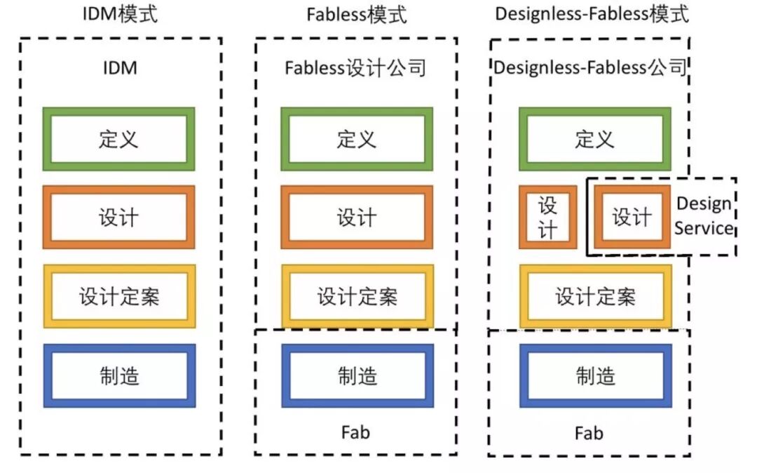 在互联网巨头入局半导体行业后,又出现了一种新的模式,即互联网公司负责定义芯片、完成小部分设计、并花钱完成设计定案流片,设计服务公司负责大部分设计,而代工厂负责芯片制造。这种新模式可以称为Designless-Fabless模式。