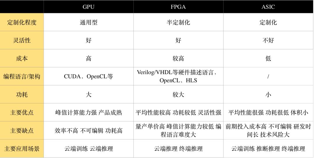 以GPU、FPGA、ASIC为代表的AI芯片,是目前可大规模商用的技术路线,是AI芯片的主战场,本文以下主要讨论的就是这类AI芯片。