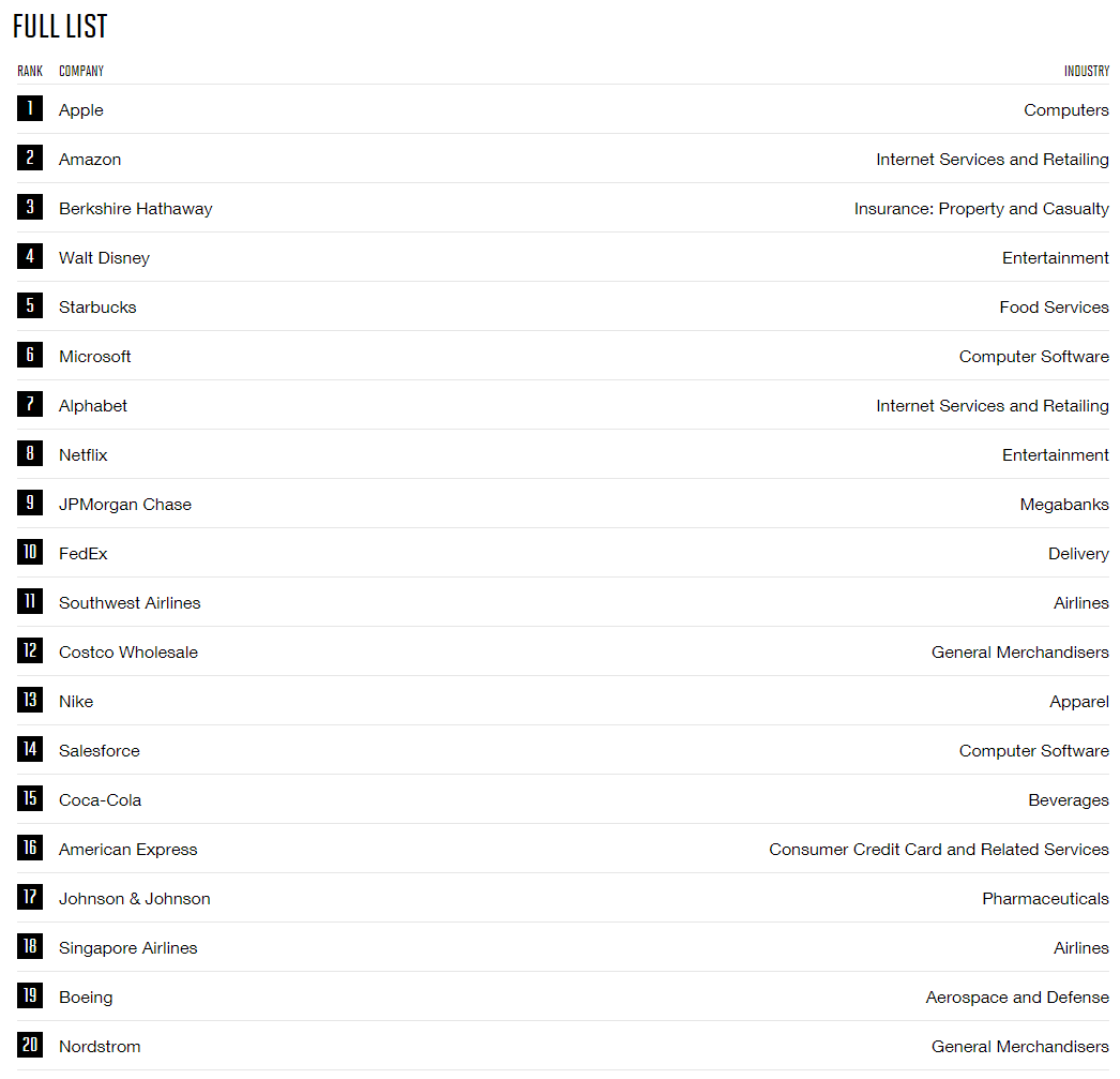 以下是《财富》公布的2018年全球最受欢迎的公司前二十名: