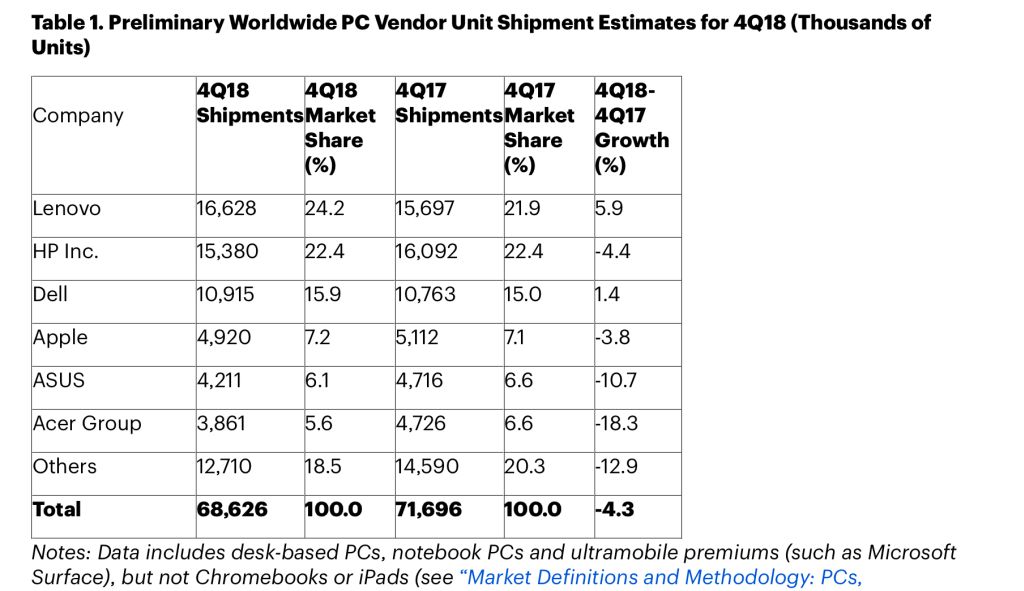 据Gartner估计,2018年 Mac的出货量总计为2.594亿台,比2017年下降1.3%。
