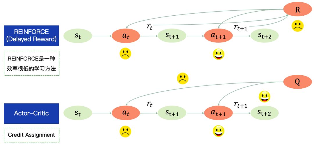 REINFORCE这类直接求解policy function的方法,效率通常比DQN低很多。以下围棋举例,比如前99步都下得很好,最后1步下的不好,导致满盘皆输。如果用REINFORCE方法,会认为这100步,包括下的不错的前99步都不好。虽然从统计意义上来说,如果下的次数足够多,梯度更新最终仍然是往正确的方向,但显然这是一种学习效率很低的算法。为了改善这个问题,另一类应用更广的方法是actor-critic,其中actor是policy,critic是评价函数,这类方法是将策略函数和值函数一同学习,核心思想是希望评价函数做能够给action返回一个合适针对它自己对于整个棋局影响的“综合”反馈