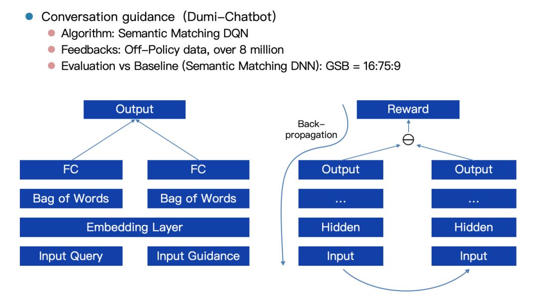 与任务型 对话系统 不同,开放式 对话系统 的潜力更大,难度也更高。 百度 早期做过一些尝试,比如聊天系统中的对话引导功能,引导用户提出下一句可能的问题。这功能的传统做法是通过语义匹配(semantic matching)网络来学习选择用户点击概率高的引导项,而通过 强化学习 来提升语义匹配网络的效果,使得语义匹配可以不单单考虑当前的点击概率,而是可以考虑后续的可能引导给出最佳的选择。