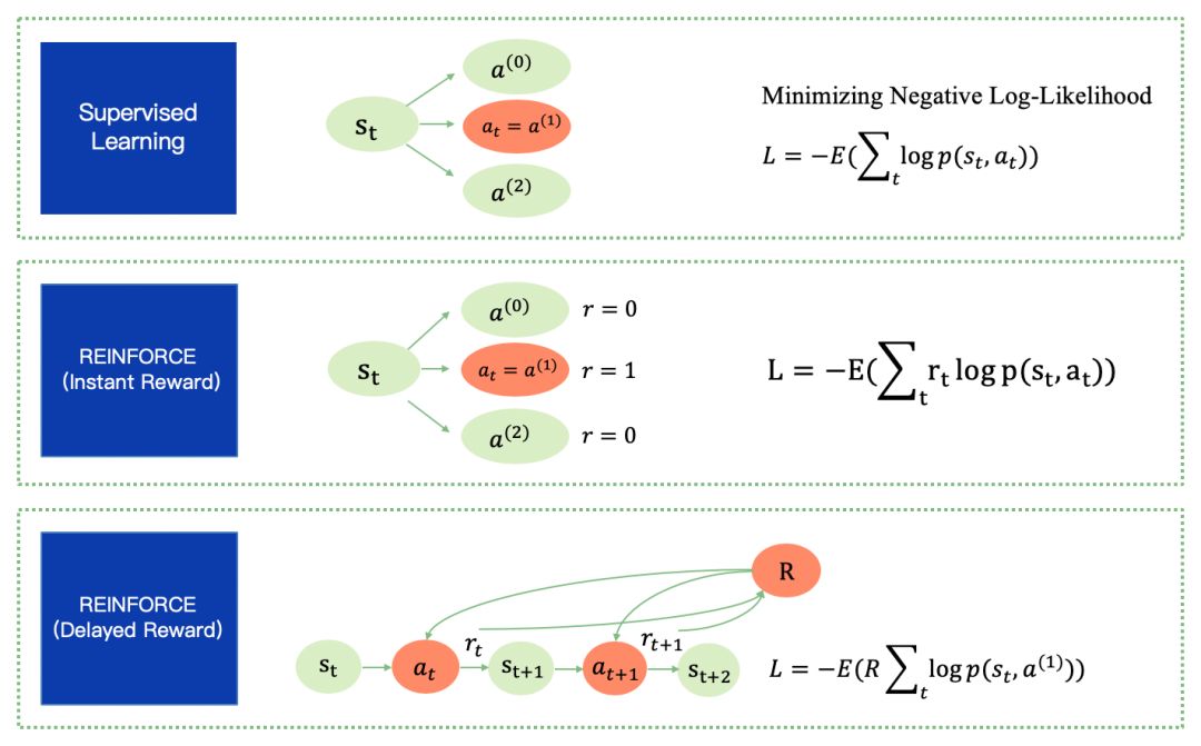 可以通过更具体的类比来理解有监督和 强化学习 的REINFORCE算法的关联。假设在t时刻action以来表示. 在有监督的学习过程中需要人来示范动作, 通常我们希望机器去学习人的示范动作,在这里就代表示范的label。我们一般可以通过最小Negative Log-Likelihood (NLL)来使得我们的policy函数逼近人的示范。