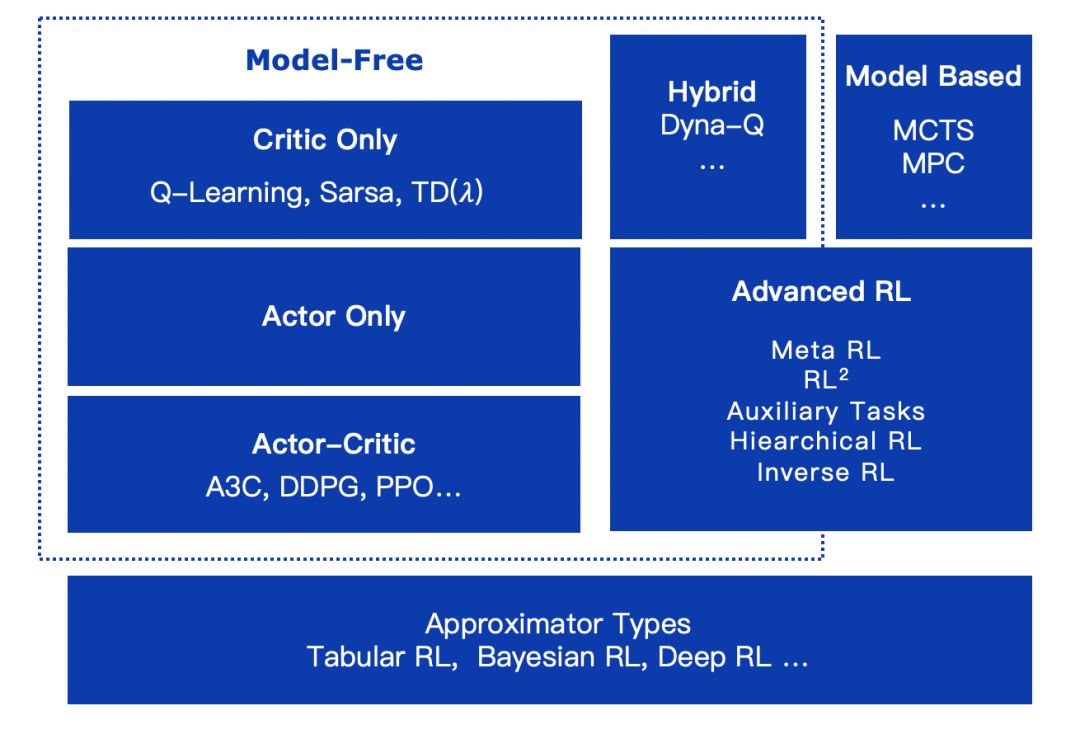 强化学习 涉及的算法非常多,种类也非常广,包括:model-free算法,这类算法最为大家所熟知,而它又可以分为critic only,actor only和actor-critic;model based算法,通过对环境建模来进行 规划 ,这类算法在训练过程中具有很高效率,但因为inference的时候需要做planning效率则较低,这类方法最近获得越来越多的关注;还有一些和不同算法结合在一起的组合RL方法,如Auxiliary Tasks, Hiearchical RL,DeepExploration,逆 强化学习 等。