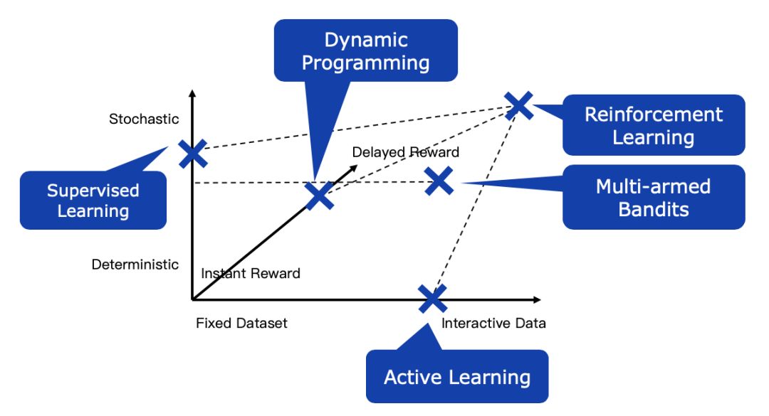 首先,从宏观层面看,可以通过“三轴”图来看 强化学习 与其他学习方法的联系和区别:第一条轴deterministic -stochastic可以描述转移概率,决策过程和奖励值分布的随机性;第二条轴fixed dataset -interactive data,表示学习数据的来源方式;第三轴instant reward -delayed reward表示奖励值是立即返回还是有延迟的。我们熟知的有 监督学习 ,针对的是静态的学习数据,以及近似可以看作无延迟的奖励; 动态 规划 针对的则是确定性的环境,以及静态的数据; 主动学习 针对无延迟的奖励以及交互型的数据;多臂老虎机(multi-armed bandits)则同时处理带有奖励随机性和交互型的数据,但依旧是无延迟的奖励问题;只有 强化学习 处理三个方向(随机,有延时,交互)的问题。因此, 强化学习 能够解决很多有 监督学习 方法无法解决的问题。