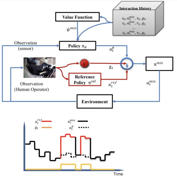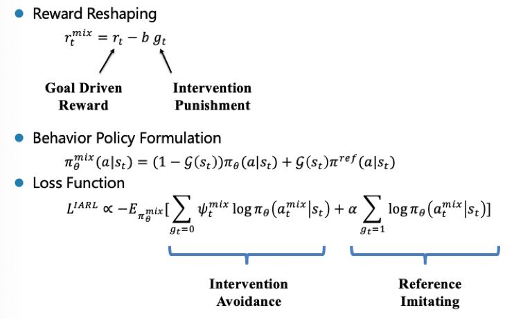 IARL在policy和loss function中的体现如下,一方面,需要修改behavior policy,因为现在的policy不再是机器完全自主,而是变成了机器和干预的混合策略;第二方面,在reward上,需要对干预的过程做出惩罚;第三方面,对于policy的 目标函数 进行修改,增加一项用于学习干预过程的imitation learningloss。