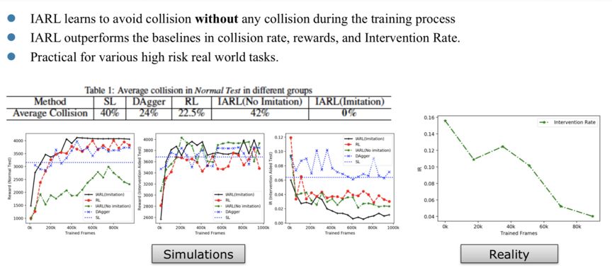 当系统做出错误判断或者出现高危动作时,安全员会及时介入。安全员的每次干预,说明机器的动作不对,这是非常珍贵的反馈信息,可以被 机器学习 。这就是干预辅助 强化学习 (Intervention Aided Reinforcement Learning)的思想。 百度 设计的IARL算法包括两个方面:1. 惩罚任何干预; 2. 学习安全员干预时所采用的操作。