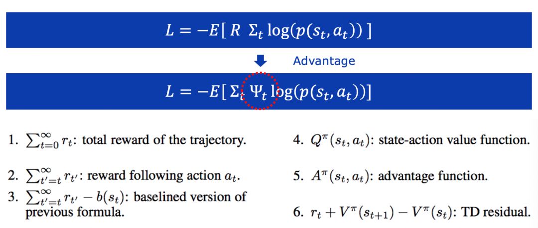 ,通常被称为credit Assignment。REINFORCE可以认为用整个序列的总体reward作为credit,而actor-critic赋予每一个动作一个独立的反馈,也叫做advantage。下面列出的是一些不同的advantage的计算方式[1]。其中,1是传统的REINFORCE,而后面的一些计算方式,则通过值函数的迭代,提升advantage计算准确性,从而提高策略梯度的效率。