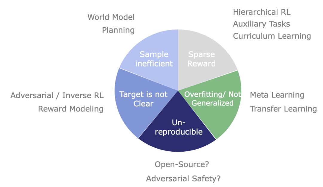 3)奖励函数过于稀疏,难以探索到优质解。研究方向比如分层训练、课程学习和引入辅助任务。