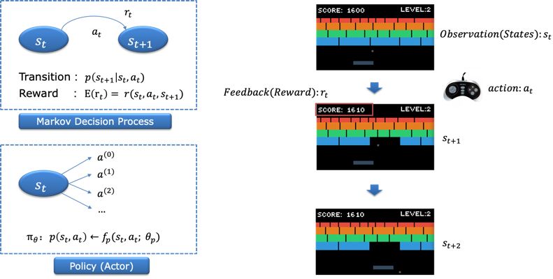 举个例子如雅利达游戏:state指看到当前电游屏幕上的图像信息;agent或者人类专家面对state可以有相应的action,比如对应游戏手柄的操作;environment在下一帧会反馈新的state和reward,整个过程可以用 马尔可夫决策过程 来描述。在这个过程中的environment则主要包括两个机制:一个是transition代表环境转移的概率,另外一个是reward。