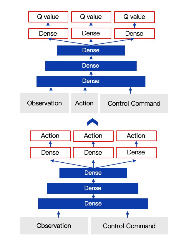 1)模型结构和学习方法上,使用deep deterministic policy gradient[7],该网络结构由4层MLP组成,将速度目标,状态,动作结合在一起建模,使得速度之间具有很好的可转移性。