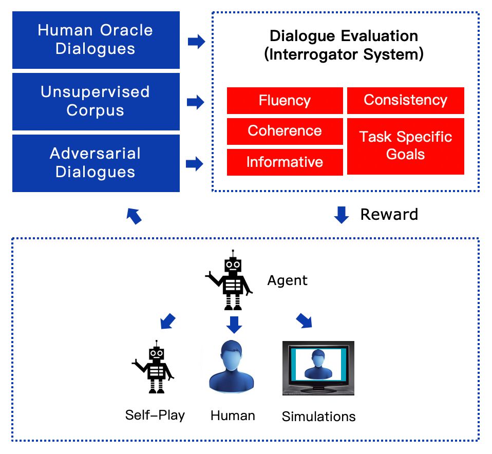 百度 目前在开展一个比较有野心的工作,就是建立一套完整的对话评估体系。基于一套完整的评估体系,有可能在包括人-机对话,机-机对话(self-play),机-模拟器 对话系统 中,引入 强化学习 ,提升对话质量。对于这套评估系统,有几个层面的要求:1)Word-level adversarial safe,使得这套评估系统能够被任何 强化学习 生成方法作为稳定的学习目标;2)和人的评估接近,可以被不同任务特化。