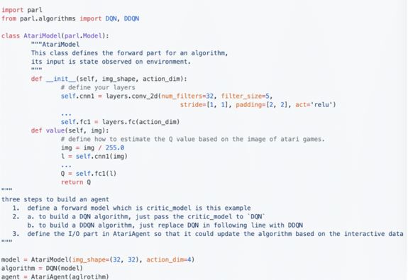 这套 强化学习 框架基于3个基础类,分别是agent、algorithm、model。通过不同层级的定制,PARL能够实现方便,灵活,可服用,定制方便的 强化学习 算法,并具有对于大规模并行能力良好支持。用户可以很方便写出自己独特的定制算法,而不必去管具体通信接口等 逻辑 。以DQN为例,PARL提供了algorithm的现成DQN算法,用户只需要定制自己的模型即可。