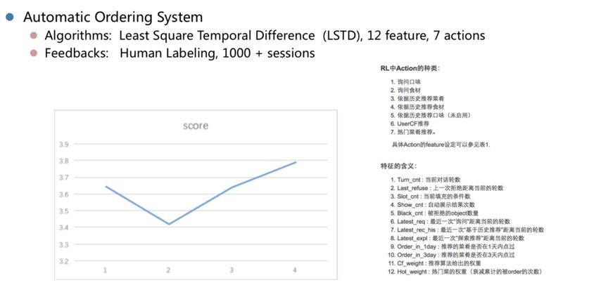百度 早在2012年就开始任务型 对话系统 的探索,其中一个早期的 强化学习 实验是2012-2013年做的点餐系统。这是一个 百度 内部员工使用的外卖订餐Demo。这个Demo基于一些NLU的特征,以及一些对话NLG的模板,利用LSTD模型来迭代对话管理 逻辑 。这个Demo设计的反馈也很粗糙,就是内部员工自己来标注。这个项目拿到一些结论,但整体不是很理想。