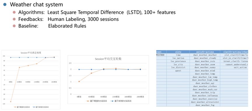 之后 百度 在各种垂类 对话系统 上进行了进一步的的实验。其中比如聊天气的垂类对话。它的特征相对点餐系统多一些,投入的人工评估和标注的资源也更多。最终效果上,有些指标能够超越人精心设计的规则策略。