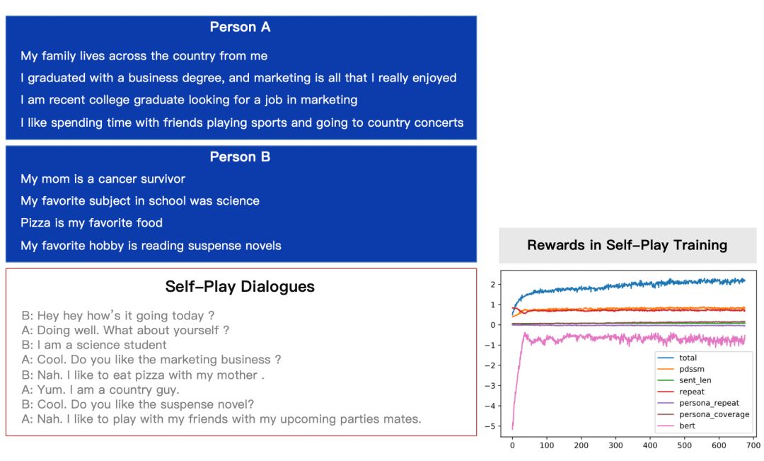 在这套框架下, 百度 开展了一些尝试性工作。图中是Facebook发布的数据集persona[6],基于两个persona(个性数据),产生两个人之间的对话。通过两个机器人相互聊,聊完之后用evaluation-system来进行评估获得reward,从而强化这两个机器人的对话。相关进展未来将发布。