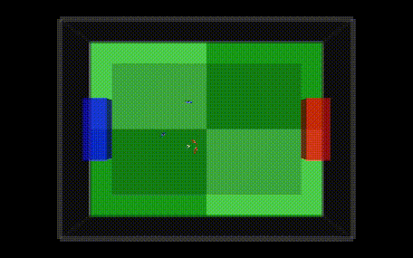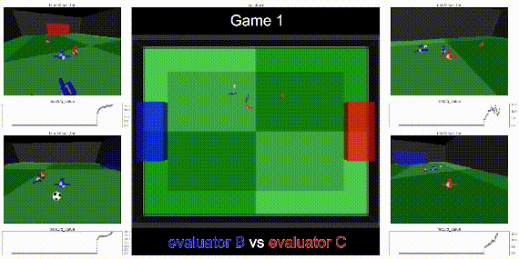 他们组织了无数场2v2的AI足球比赛,并设定了规则,一旦有一方得分或者比赛超过45秒,比赛就结束。