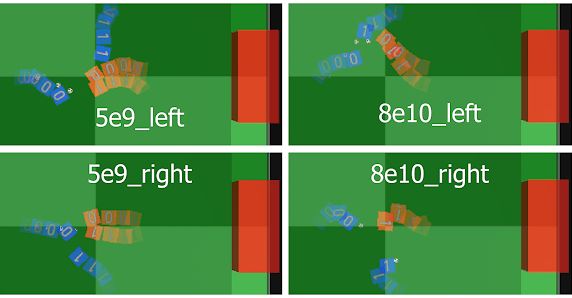 在上图中, DeepMind 展示了代理行为的典型轨迹:在5B步骤中,当代理更个性化地行动时,我们观察到无论blue1的位置如何,blue0总是试图自己运球。但在训练的后期,blue0则积极寻求团队合作,其行为呈现出由其队友驱动的特点,显示出高水平的协调精神。特别是在“8e10_left”这一场比赛中中, DeepMind 称他们观察到了两次连续传球(blue0到blue1和后卫),这是在人类足球比赛中经常出现的2对1撞墙式配合。