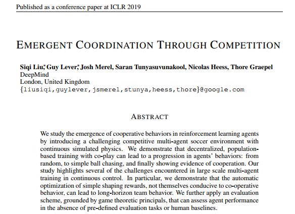 DeepMind 此项研究意义重大,将2v2足球领域引入多智能体协作是以前没有过的研究,通过 强化学习 研究,利用竞争与合作来训练独立智能个体,展示了团队的协调行为。