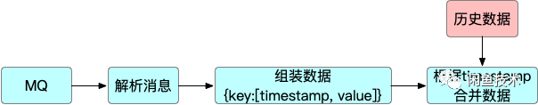 {key:[timestamp,value]},key是字段名称,value是字段值,timestamp为字段数据产生时间戳;将组装后的数据和内存中保存的历史数据根据timestamp进行字段级别数据合并,合并算法为比较timestamp大小取最新字段值,具体逻辑 见下图。