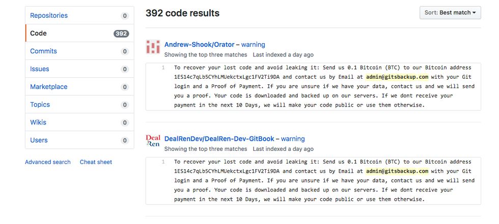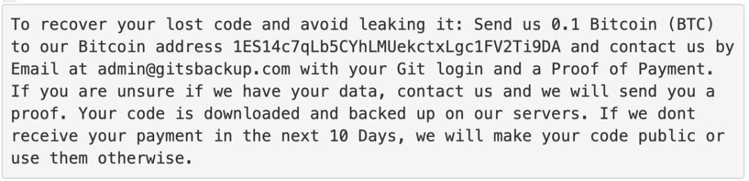 这一攻击很快被人们注意到,目前至少在 GitHub 上就已波及了至少 392 个不同的用户。「为了恢复你失去的信息并让它们免于泄露,请交给我们 0.1 比特币(BTC)给账户 1ES14c7qLb5CYhLMUekctxLgc1FV2Ti9DA,并发邮件给 admin@gitsbackup.com 告知你的 Git 账户和付款凭证。」勒索信中写道。