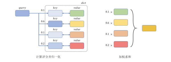 3. 将归一化后的评分与 value 加权求和得到 Attention 的结果: