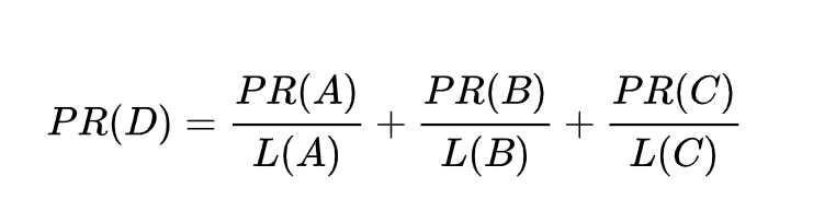 2. 假设 A 网页共指向了 L(A) 个网页,则每个指向的重要程度(被使用的概率)为 PR(A) / L(A);