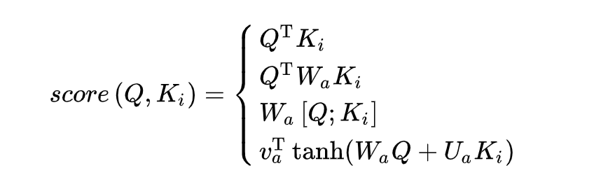 1. 计算 query 与所有 key 的相似度,得到评分。以下四种方法都较为常见: