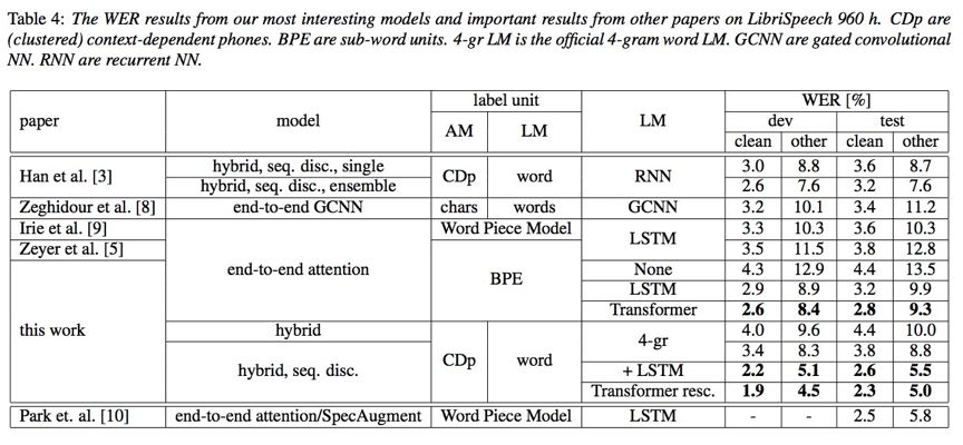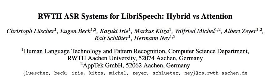 同时,随着端到端 语音识别 框架日益完善,研究者们对端到端模型的训练和设计更加的关注。RWTH的研究者在“RWTH ASR Systems for LibriSpeech: Hybrid vs Attention”一文中,详细的研究了基于端到端 语音识别 框架,我们可以从建模单元、声学模型建模模型、 语言模型 等各个方面来提升端到端识别系统的整体性能。