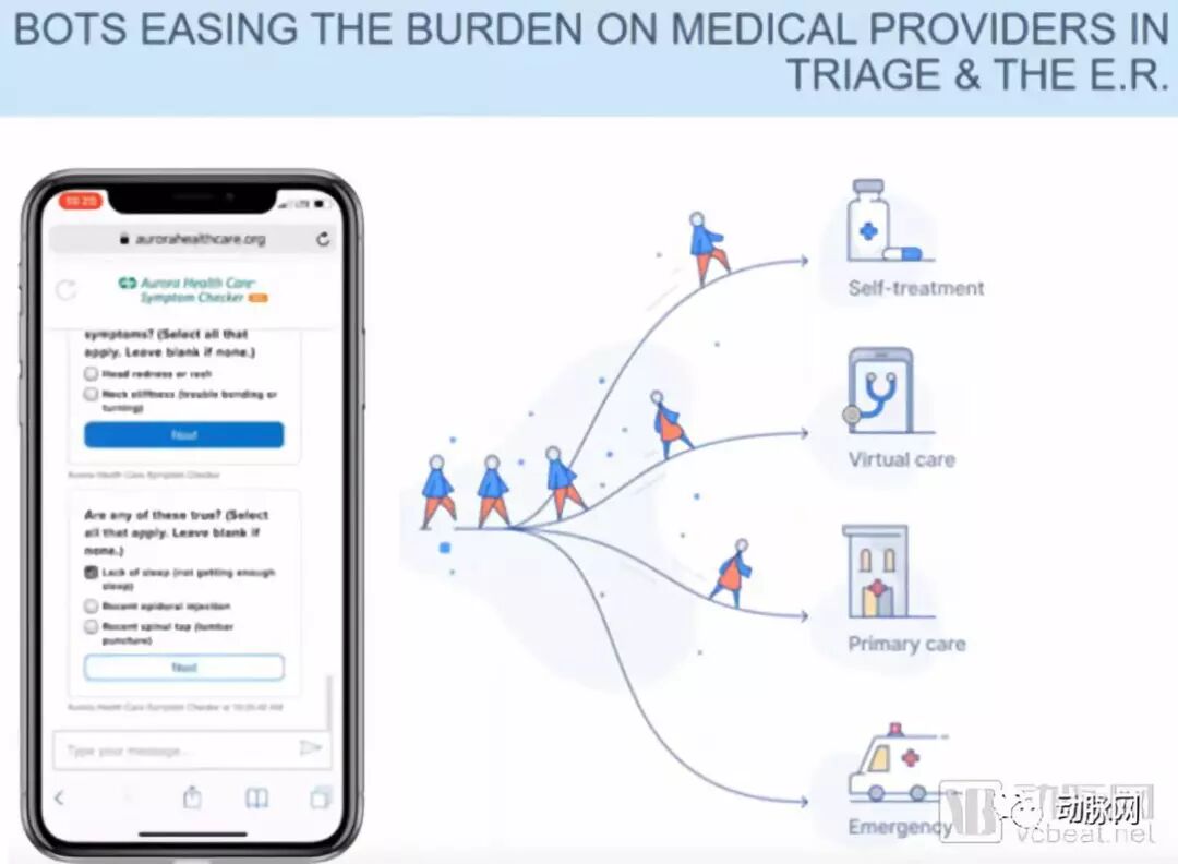 美国健康组织Aurora Health Care拥有15家医院、150家诊所、70家药店。处理分诊与急诊压力占用了大量的医疗资源,Aurora Health Care与 微软 Health bot合作尝试应用 聊天机器人 工具来进行缓解。