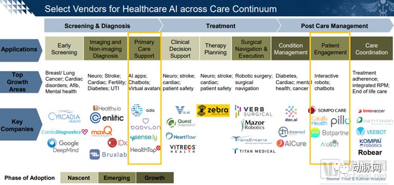 Frost & Sullvian在今年发布的一份医院创新报告里列出了AI在医疗服务方服务环节中的应用分布,我们用黄色框出来的两块chatbot应用环节:一个是初诊支持,另一个是患者激励。