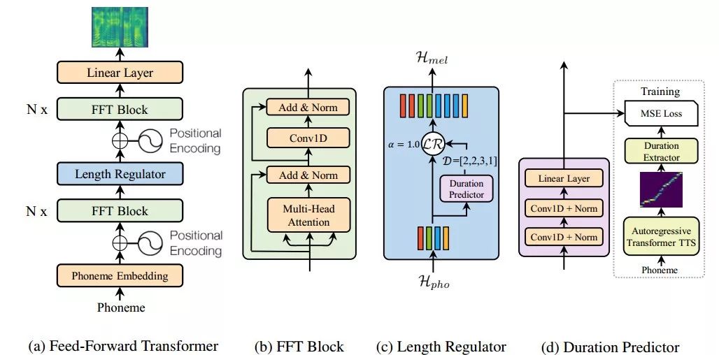 为了解决上述的一系列问题,本文提出了一种基于 Transformer 的新型前馈网络 FastSpeech,可以并行、稳定、可控地生成高质量的梅尔谱,再借助声码器并行地合成声音。FastSpeech 模型结构如下图所示,主要构成为前馈 神经网络 (Feed-Forward Transformer),长度调节器(Length Regulator)以及音素持续时间预测器(Duration Predictor)。前馈 神经网络 能让模型并行的生成梅尔谱,同时抛弃了传统的编码器-注意力-解码器结构,提高合成语音的稳定性。长度调节器通过音素时间预测器来预测每个因素的持续时间,进而调整音素序列和梅尔谱序列的长度差异,同时还能调节生成语音的语速以及停顿等。详细模型结构可参见论文。