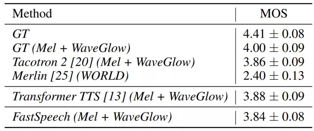最后,FastSpeech 的语音质量可以与传统端到端 自回归模型 (如Tacotron 2和Transformer TTS)相媲美(如表2所示)。