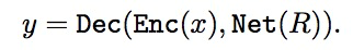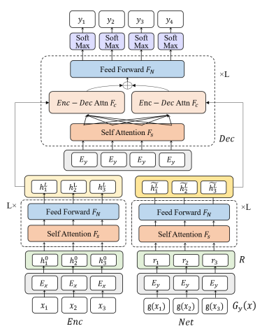 我们以 机器翻译 为例,在 Transformer 模型上介绍这种原型序列。如下图所示,对于给定输入序列,首先利用上述概率生成器 g 获得原型序列 R,并利用网络 Net 将其编码为上下文向量表示。原始输入序列和原型序列的上下文表示共同作用于解码器的编码-解码注意机制中,进行解码。
