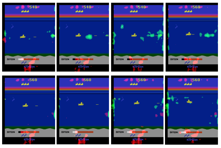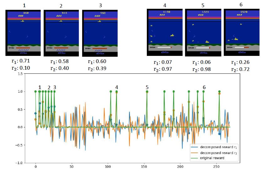 同时,我们的算法也能得到有意义的奖励分解(图3)。当画面中的潜艇上岸补充氧气时,第一个分支 r_1 能捕获更多的奖励信号;相反当潜艇射击小鱼时,第二个分支 r_2 能捕获更多的奖励信号。