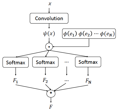 其中 Enc 和 Dec 分别是标准编码-解码器框架中的编码器和解码器网络,Net 是一个额外用于编码原型序列 R 的网络。定义 E_y 为目标域的词向量矩阵,维度为 |V_y| × d。用 1(y’) 表示目标域的序列 y’ 所对应的维度为 l_y×|V_y| 的独热向量表达,其中的每一行对应一个单词的独热向量。序列 y’ 的 soft 原型序列 R 计算为: