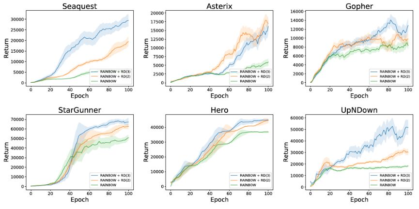 我们将 DRDRL 在 Atari 游戏上进行了测试(图2),结果显示我们的方法能大幅度提高 RAINBOW 的性能。