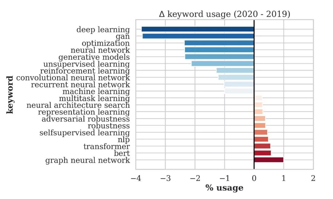 20日 ICLR 放榜,本次大会一共收到了 2594 篇论文,接受了 687 篇,接受率为 26.5%。而此次会议中,不管是收到的,还是接受的图相关的论文都再次突破。有网友统计了2019 年到 2020 年各大顶会提交论文关键词的数据。