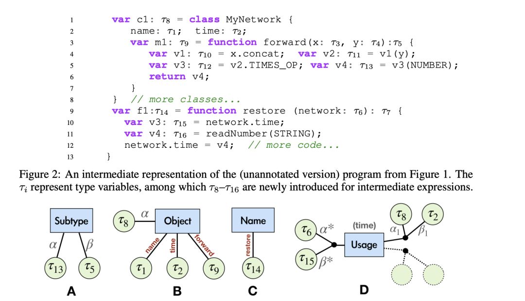 这篇文章研究的是用图神经网络进行推理,具体的场景是进行代码的类型注释,比如在 Python 或者 Typescript 之类的语言中。文章提出了一种基于图神经网络的概率型Typescript 推理方案。首先使用轻量级的源代码分析来生成程序抽象——类型依赖图,该图将类型变量与逻辑约束以及名称和使用信息链接在一起。给定该程序抽象之后,使用图神经网络在相关类型变量之间传播信息,并最终进行类型预测。