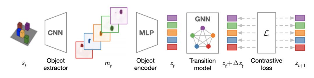 C-SWM 模型的组成包括一个基于 CNN 的对象提取器,一个基于MLP 的对象编码器,一个基于GNN 的关系转换模型,一个对象分解对比损失。