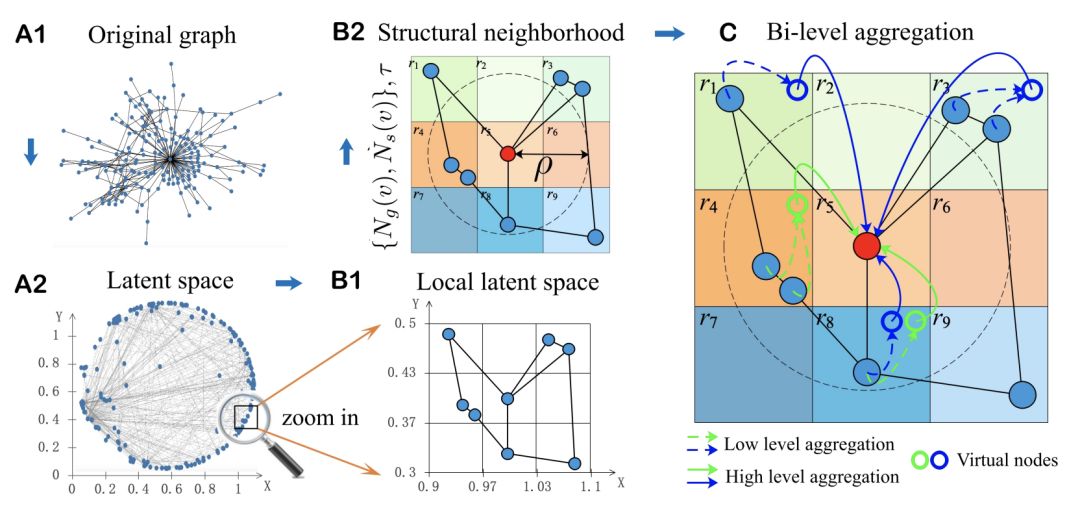 Message-passing neural networks (MPNNs)成功应用于图表示学习。但是,MPNN 的两个基本弱点限制了它们表示图数据的能力:丢失邻域中节点的结构信息,并且缺乏捕获散布图中长期依赖关系的能力。很少有研究从不同角度注意到这些缺点。文章提出了一种新的图神经网络几何聚合方案,来克服这两个缺点。背后的基本思想是,图上的聚合可以从图潜在的连续空间中获益。该聚合方式具有排列不变性,由三个模块组成:节点嵌入、邻域结构以及双层聚合。