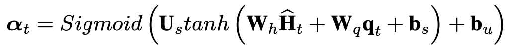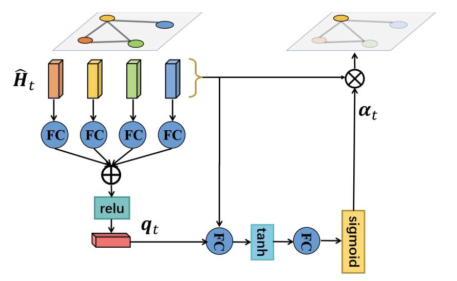 计算得到一个attention系数 αt,注意 αt长度是一个长度为 N(节点数)的向量,最终该时间步节点 i 的输出值为: