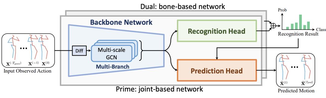 首先将 bone 也作为一个独立数据分支,通过和 joint 流融合得到预测结果。(上图中的 Dual 和 Prime )。