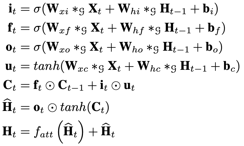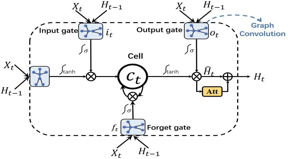 和传统LSTM一样都具有三个门结构,输入门,遗忘门,输出门。但是这些门是通过图卷积操作来计算的。单元结构和计算公式如下: