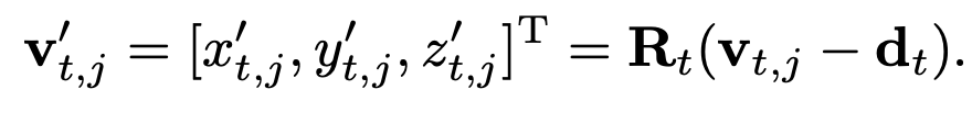 本文提出了一种视角自动学习网络来解决这个问题,即让网络自行学习最佳的摄像机视角,即对骨架进行一定的旋转和平移,参数为[ αt, βt, γt, dt],其中前三个分别对应是三个轴的旋转参数, dt表示位移,因此变换公式为: